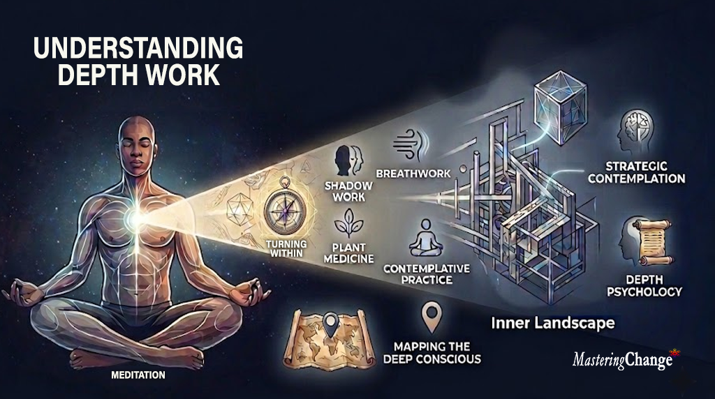 Depth work is not a single method. It is a category. Turning Within, meditation, shadow work, breath work, plant medicine, contemplative practice, and strategic contemplation all belong to it. What they share is a common target. And that target is not on the surface.